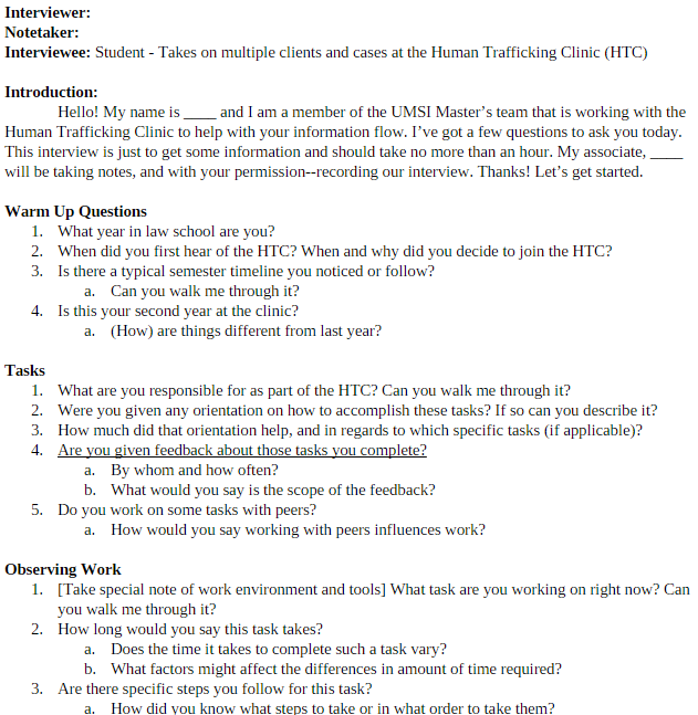 We began by researching the Human Trafficking Clinic (HTC) to gain more context about our project. I specifically looked into the other law clinics at the University of Michigan. I contacted them to understand how they function, and inquire as to what - if any - case management system(s) they were utilizing. The HTC utilized a case management system known as PIKA, as did some other clinics - partially due to a University-wide license that did not require individual clinic purchase. But even among different clinic types (litigation and transaction), many different systems were used. Some were other case management systems, some were collaboration tools, and some didn't use any technical system at all. We then interviewed our users. We asked our interviewees to walk-through their workflows with the HTC. Questions were asked about PIKA specifically, a complete overall interaction with clinic clients, current breakdowns. We got answers to these questions from the three different perspectives - HTC administrative staff, lawyers, and students. To analyze the information we had collected, we created an affinity wall. We each pulled quotes from our interviews and created notes for each of them. We worked together to group similar quotes together, also pruning down quotes we all decided were not necessary. We created and delivered a final report to the HTC (keeping in mind that their (lack of a) budget), including detailed recommendations for solutions which are simplified here: 1. Have students prepare short audio and/or video recordings to accompany their case transfer memos; 2, More frequent and/or thorough case audits, including L Drive location information presence in PIKA entries; 3, Creating and enforcing simple, standardized naming conventions, including tags; 4, One centralized, shared Google calendar for use of important case dates; and 5, A discussion and creation of general organizational duties, allowing room for the flexibility of the HTC.